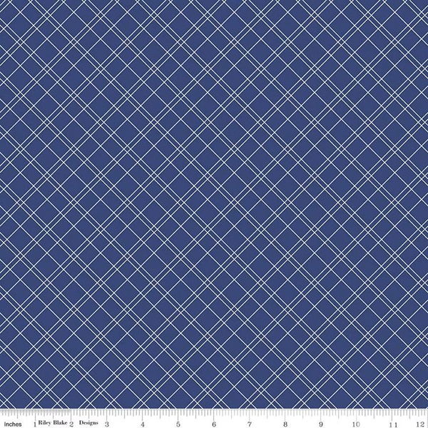 C16657 Navy Grid by Sandy Klop of American Jane for Riley Blake Designs.  This bold print features a diagonal plaid print with thin white lines on a navy blue background. 100% cotton fabric perfect for quilts, bags and dress making.