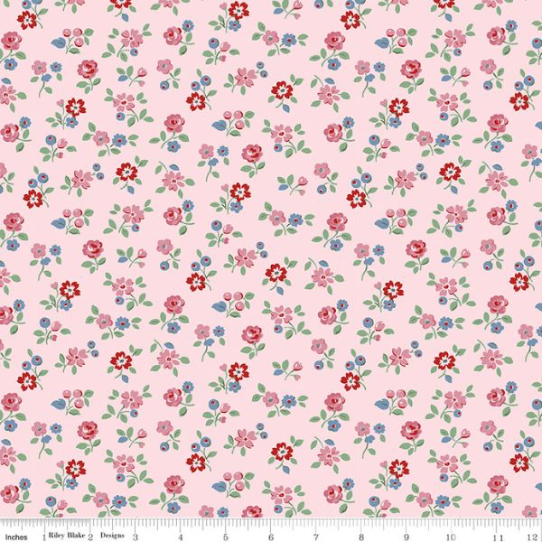 C18373-Pink Arlington Ditsy, Cath Kidston Signature Collection by Riley Blake features a beautiful design of red, pink and blue ditsy flowers dotted on a soft pink background.