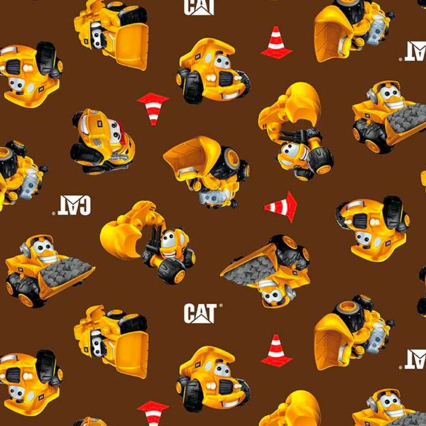 C8101 Brown Wrigglers features a brwon background with images of Caterpillar logo and diggers, and trucks all over! This fabric is perfect for quilts for Children and nurseries.