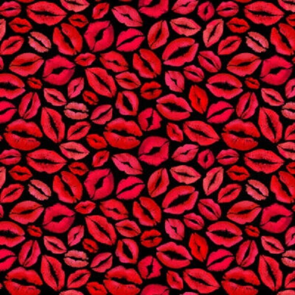 C8536 Black Lips and Kisses by Timeless Treasures is a design of red lips on a black background.
