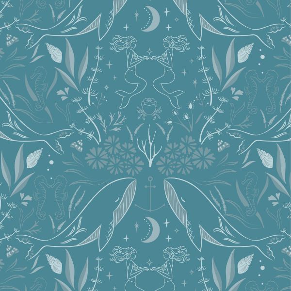 CC12.2 Enchanted Ocean in Light Aegean Blue is a magical cotton fabric featuring underwater motifs, mermaid sirens and whales.