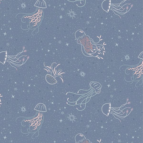 CC13.3 Jellyfish Dance in Porpoise Purple is a magical cotton fabric featuring underwater jellyfish in a repeating pattern.