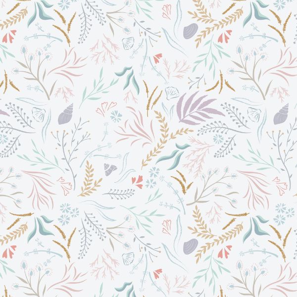 CC14.1 Seaweed Sway in Sea Mist Blue is a magical cotton fabric featuring a beautiful repeating pattern of floral seaweed and shells.