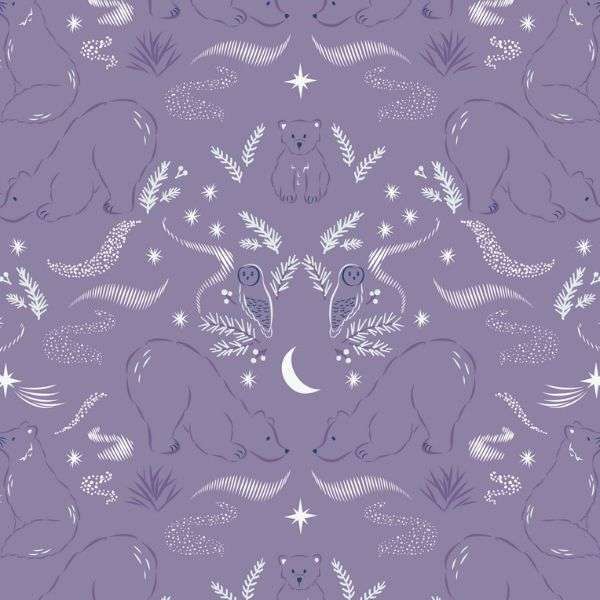 CC28.2 Arctic Light, Winter Nights Purple by Cassandra Connolly. Cute baby bear sits under the sky spell bound while the animals of the arctic gather around as their focus drifts from bear to night sky.