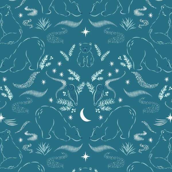 CC28.3 Arctic Light, Winter Nights Teal by Cassandra Connolly. Cute baby bear sits under the sky spell bound while the animals of the arctic gather around as their focus drifts from bear to night sky.
