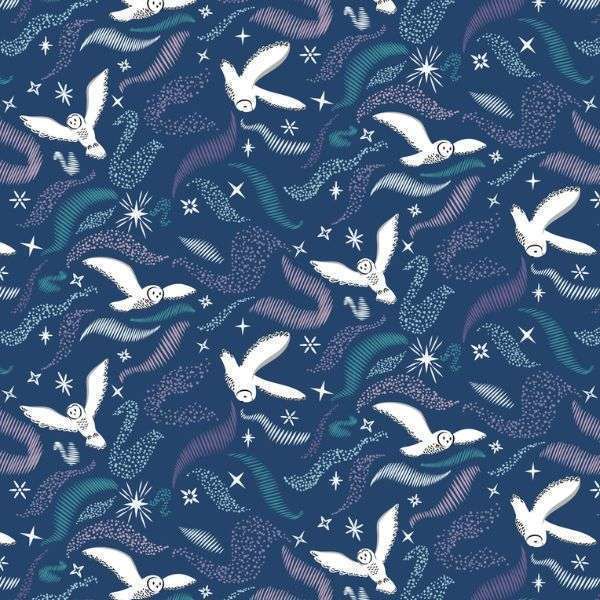 CC29.3 Arctic Aura, Midnight by Cassandra Connolly. This is a tossed print featuring graceful snowy owls flying amongst the magical lights and pearlescent stars