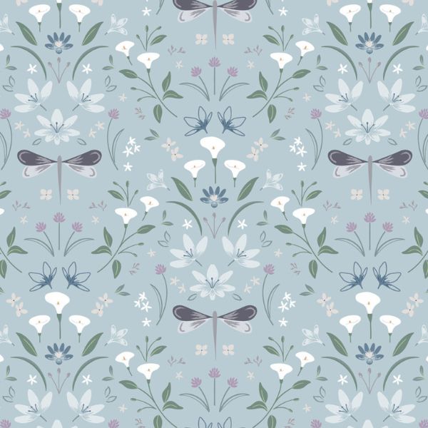 CC36.2 Graceful Reflections Duck Egg Blue, The Water Gardens by Cassandra Connolly is an elegant design of flowers, leaves, and dragonflies on a pale blue background.