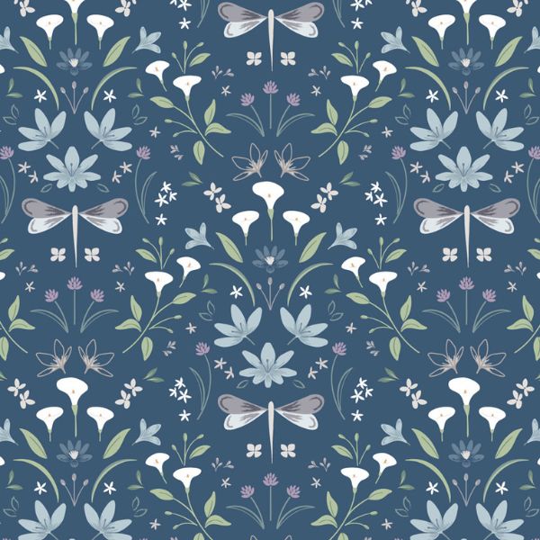 CC36.3 Graceful Reflections Navy Blue, The Water Gardens by Cassandra Connolly is an elegant design of flowers, leaves, and dragonflies on a navy blue background.
