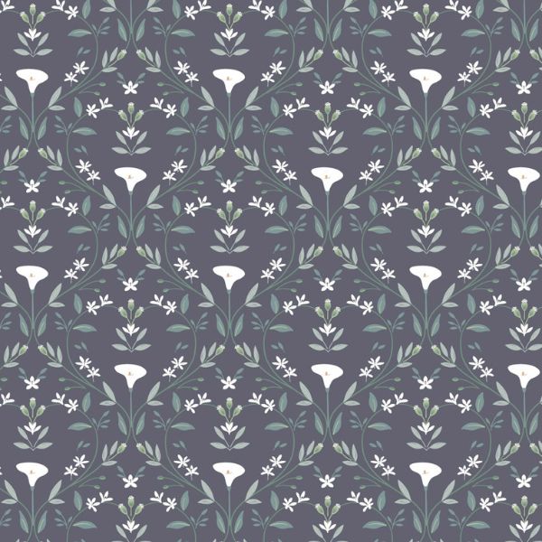 CC37.3 Serenity Charcoal, The Water Gardens by Cassandra Connolly is a subtle heart shaped design using leaves and flowers on a charcoal background.