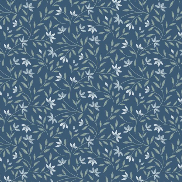 CC39.3 Wild Harmony Navy Blue, The Water Gardens by Cassandra Connolly is a design of delicate flowers with green leaves on a navy blue background.