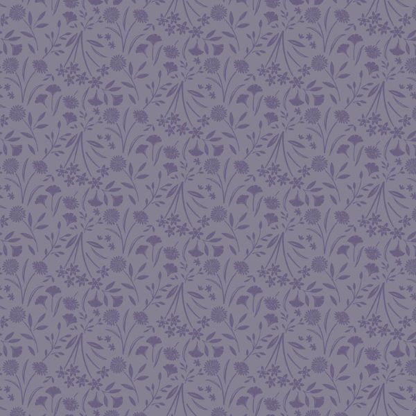 CC45.3 Floral Dusk Dusky Purple, Evenfall by Cassandra Connolly is a design of delicate florals and foliage on a dusky purple background.
