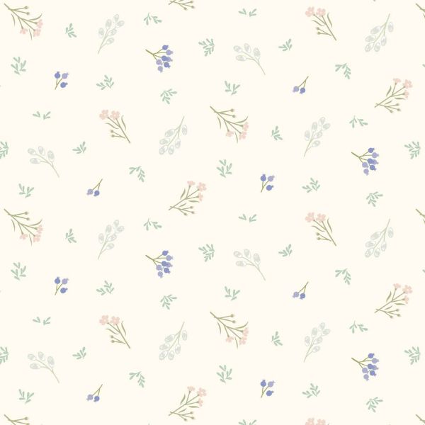 CC58.1 Scattered Sprig Cream, Sky Garden by Cassandra Connolly features delicate green sprigs with tiny leaf clusters and purple seed pods, lightly scattered across a warm cream background. This subtle, nature-inspired print brings a fresh, airy feel perfect as a calming blender or gentle feature fabric in quilts, accessories, and home décor.