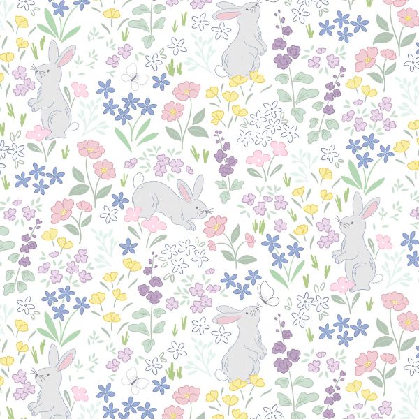 CC66.1 Chasing Tails White, Dear Spring by Cassandra Connolly is a pattern of colourful flowers on a white background with adorable bunnies enjoying the spring flowers.