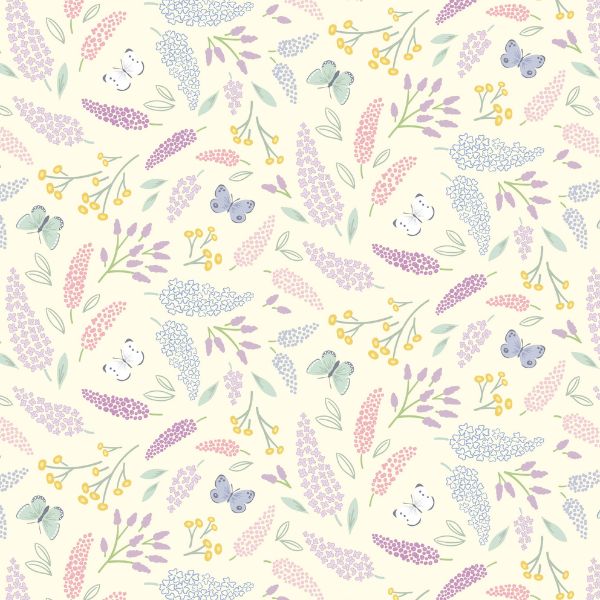 CC67.1 Spring Symphony Dark Cream, Dear Spring by Cassandra Connolly is a pattern of pastel flowers and butterflies on a dark cream background.