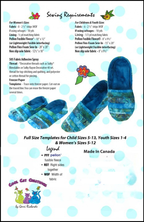 Make matching slippers for you and your little one with this pattern. Here is a fun pattern if you have been saving your selvages, or you can use 2.5″ strips (pre-cut or scraps). The pattern has full size templates, women’s u.s.a 5-12, children’s u.s.a 5-13 and youth u.s.a 1-4. The pattern uses a foam interfacing for the slipper tops and removable inserts.