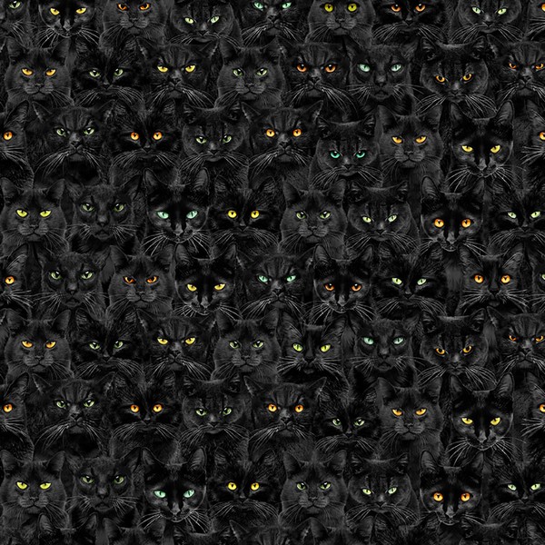 CD1831 Wicked Black Cats Magic – part of the Mystic Library collection of fabrics. Featuring black magical cats with green, orange, and yellow eyes.