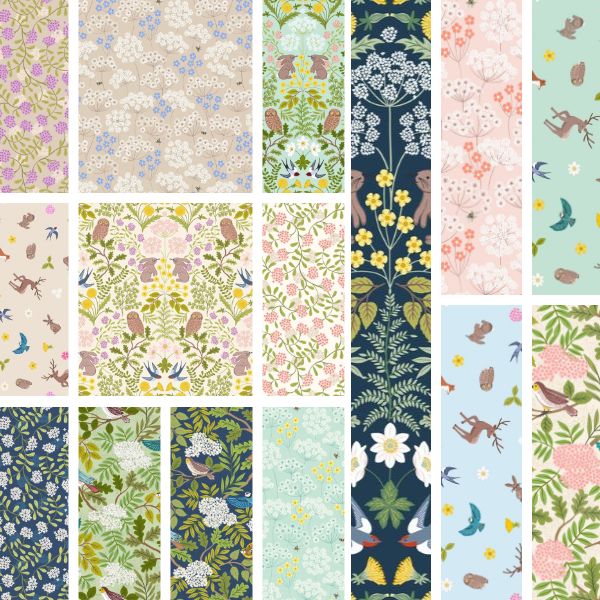 Clearbury Down Full Collection: Fat Quarter Pack (15pcs) by Lewis and Irene, is a beautiful collection of fabrics, featuring woodland animals, owls, rabbits, birds, deer, bees and pretty floral patterns.