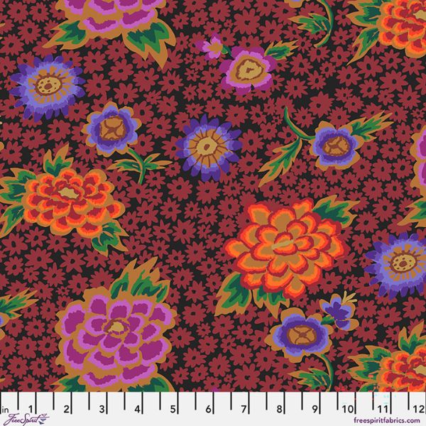 CLGP006.Dark Charlotte, Kaffe Fassett Cotton Lawn features a vibrant design of big colourful flowers dotted on a black background with tiny burgundy flowers.