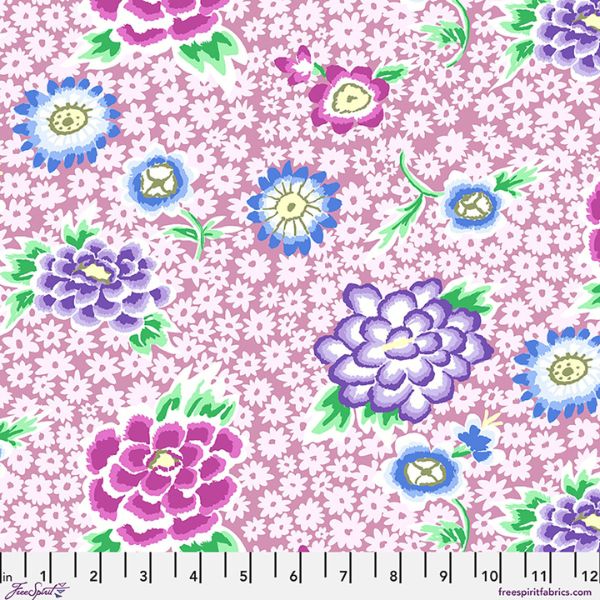 CLGP006.Pastel Charlotte, Kaffe Fassett Cotton Lawn features a vibrant design of big flowers of purple, blue and pink dotted on a soft pink background with tiny light flowers.
