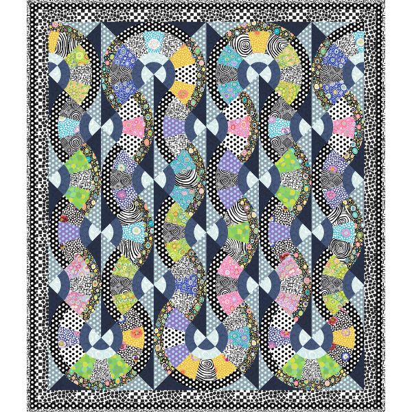 Contrast Fanfare Quilt Kit by Kaffe Fassett Collective is a hand-pieced quilt inspired by an antique design from his collection. The curved piecing and the flat-back stitch create flowing arcs and movement across the quilt. The kit includes all fabrics for the quilt top, binding, the pattern, and the Paper Pieces Fanfare Quilt Pattern Pack.