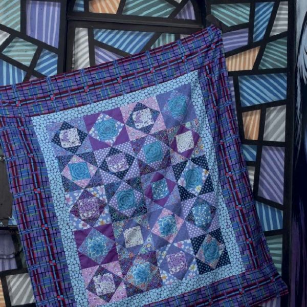 This quilt is created using the traditional ‘economy’ block, popular during the Great Depression in the 1930s as it used up small scraps of fabric. It is also known as the ‘square in a square’ block, used here to show off fussy-cut prints in the centre squares, while playing with contrast and colour in the surrounding triangles.