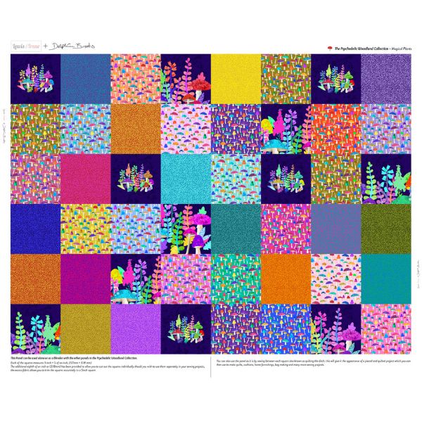DB22 Magical Plants 5″ Squares Panel by Delphine Brooks for Lewis and Irene is comprised of 5″ squares featuring multi coloured mushrooms and woodland foliage.