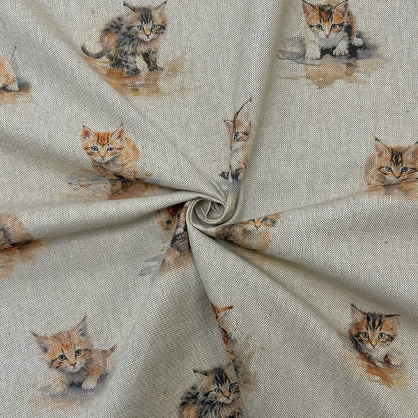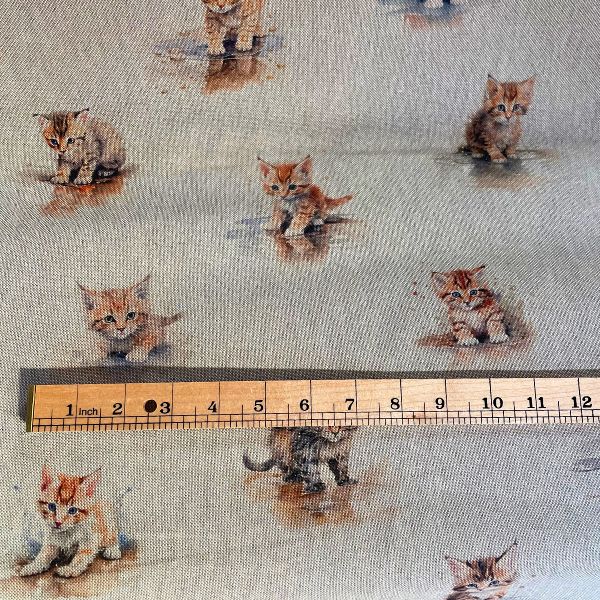 All Over Kittens Digitally Printed Canvas – a stunning high quality digitally printed cotton-rich linen look fabric. Featuring an adorable animal print of kittens in puddles on a natural coloured background.