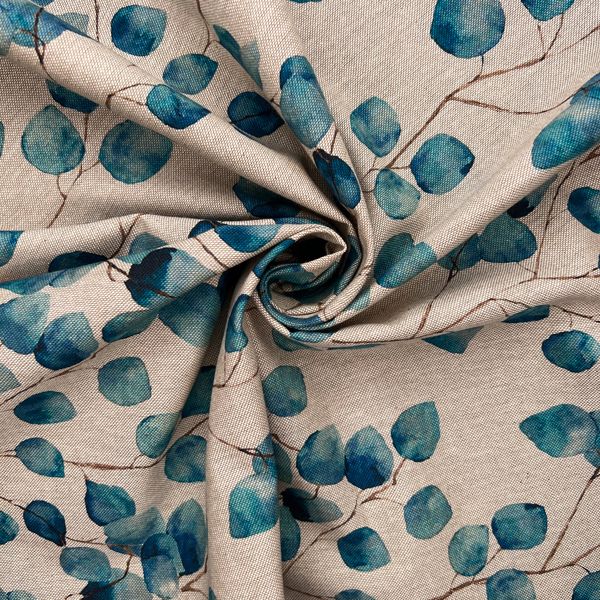 DCL053 Watercolour Leaves Teal linen look canvas. Cotton rich craft fabric – digitally printed panama. Suitable for curtains, seat cushions, cushions and other creative purposes.
