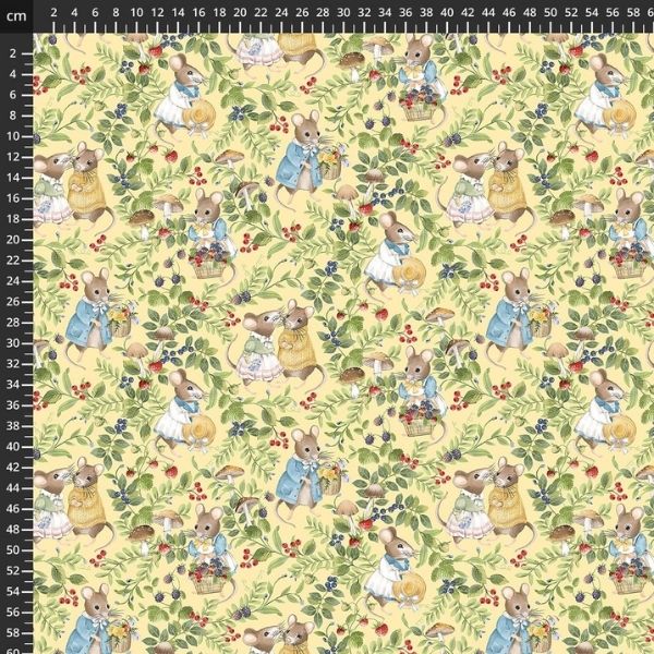 DP29006-52 Country Mouse by Deborah Edwards features mice in cute outfits with leaves, mushrooms and berries on a pale yellow background.