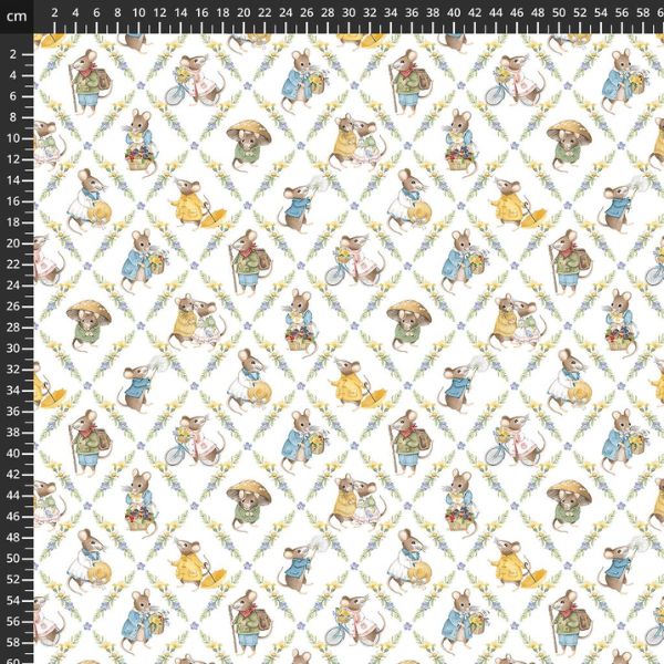 DP29008-10 Country Mouse by Deborah Edwards features little mice on a white background with a floral diamond pattern.  The print includes a mouse with a dandelion, a mouse on a bicycle and a mouse in a raincoat with an umbrella.