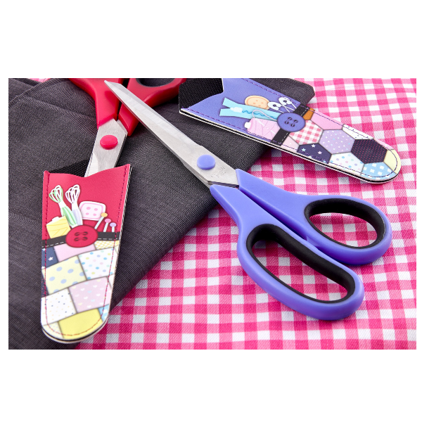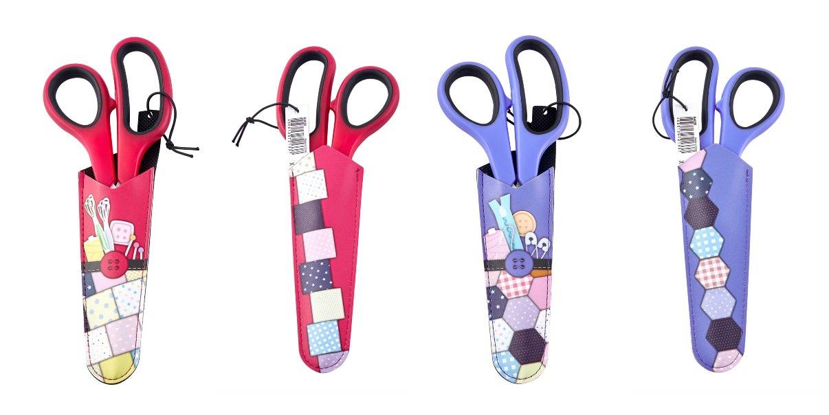 Scissors are packaged in a sewing themed plastic pouch for storage and transportation