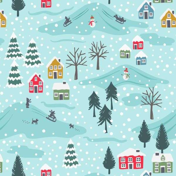 F34.2 Snow Day on Blue (Flannel) by Lewis & Irene features a beautiful winter scene with trees, houses and people playing in the snow.