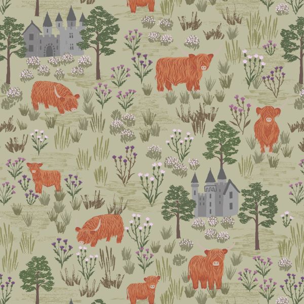 F538B Castles and Highland Cattle on Light Sage, Loch Lewis Flannel by Lewis & Irene features castles, thistles, and cattle on a green background.
