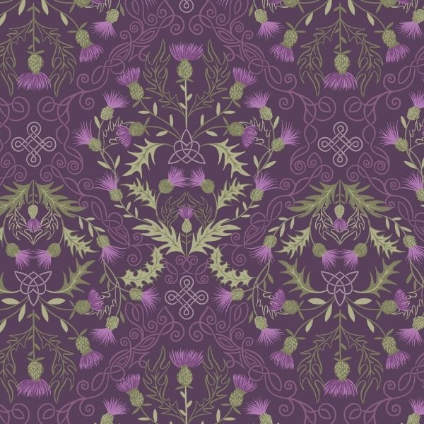 F541C Thistle on Dark Purple, Loch Lewis Flannel by Lewis & Irene is a design of swirls in diamond shapes with thistles inside on purple.