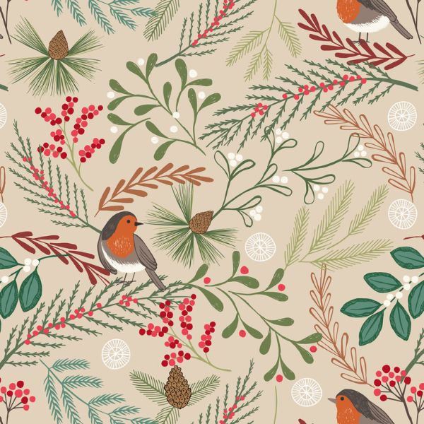 F58-1 New Forest Winter Flannel: Robin on Dark Cream, Lewis & Irene. A beautiful fabric inspired by The New Forest in Hampshire. Featuring robin red breasts, stars, mistletoe and winter foliage, on a dark cream background.