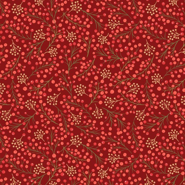 F62-2 New Forest Winter Flannel: Winter Berries on Red, Lewis & Irene. A beautiful fabric inspired by The New Forest in Hampshire. Featuring red winter berries on green stems, on a red coloured background.