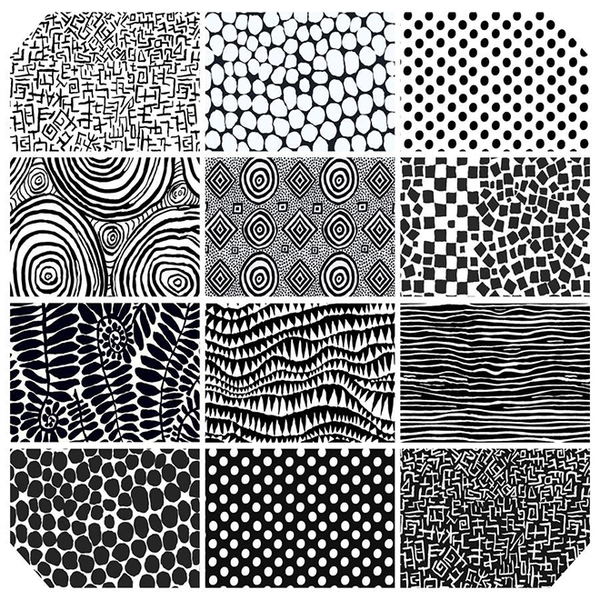 FB1210GP.BLACKWHITE Classics 10″ Charm Pack (42pc): Kaffe Fassett Collective: Kaffe Fassett Collective 10″ charm pack featuring bold beautiful fabrics in black and white.