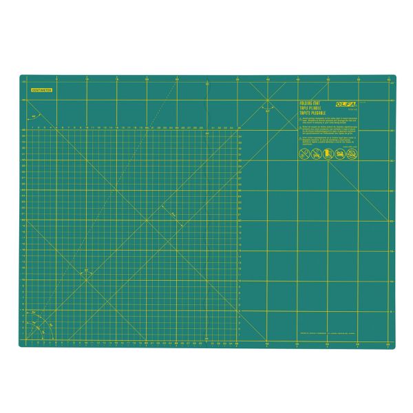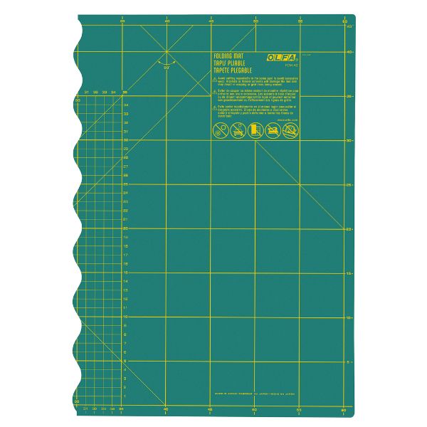 FCM-17X24 Cutting Mat: Folding: 62 x 45cm (A2) fold to half-size making it easier to store and carry. With a special non-slip backing and a curved join designed to fit together snuggly to prevent blade snap in the gap. Mat has easy-to-read numbers and a yellow inch grid for patchwork and quilting.