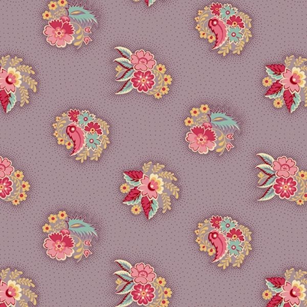 21026-P Fred in Purple is a beautiful vintage floral. Featuring hints of turquoise, pink and red on a purple dotty background. This collection features a smaller floral print, all inspired by their love of everything vintage.