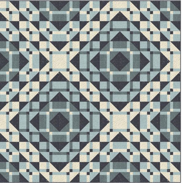 Fry Quilt Kit 76.5 x 76.5in, Data by Janet Clare features a geometric design of blues and cream, creating a diamond effect. The quilt kit includes all fabrics for the quilt top, binding, and the pattern. The finished quilt top measures approximately 76.5 x 76.5in.