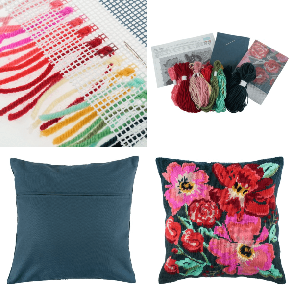 Pre-printed, large hole, polycotton canvas, polyester yarns, needle, cotton cushion back with pre-inserted zip, front sheet picture and instructions.