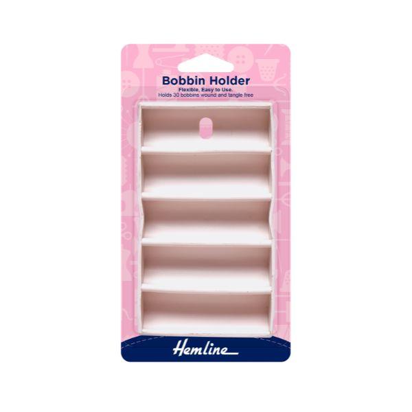 H158 Hemline Bobbin Holder is a sturdy bobbin tray for 30 bobbins of all common sizes. Holds bobbins firmly, keeping them wound tight and untangled. Flexible, easy to use. This holder can be wall mounted.