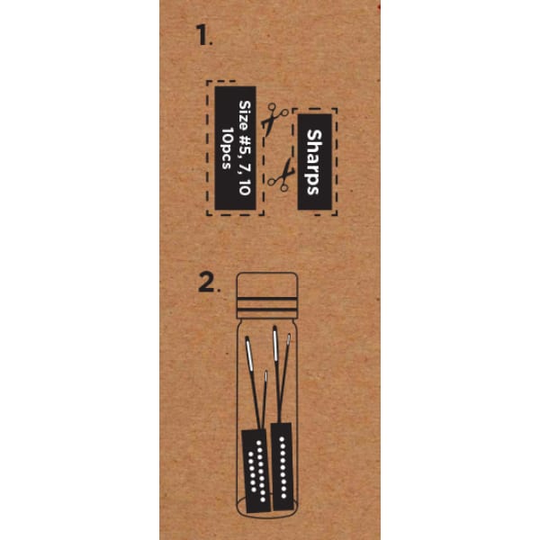 Premium quality sharps needles in a reusable glass jar with a brushed gold lid. Quality needles made from strong nickel-plated carbon steel with a small, gold eye for extra strength. Jar contains 4 each of sizes 5 & 7 and 2 of size 10. Perfect for general sewing and crafting.