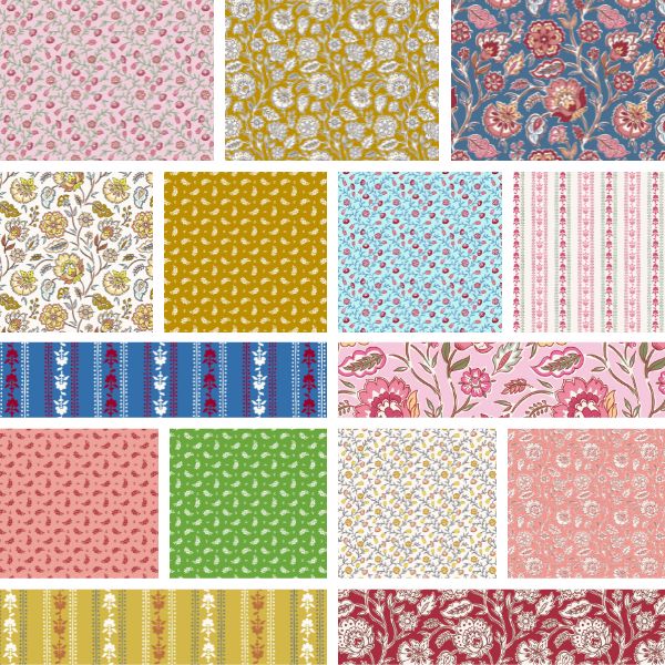Indian Summer Fat Quarter Pack (15 pcs) by Stuart Hillard contains all 15 designs from the Indian Summer collection in shades of pink, gold, indigo and red.