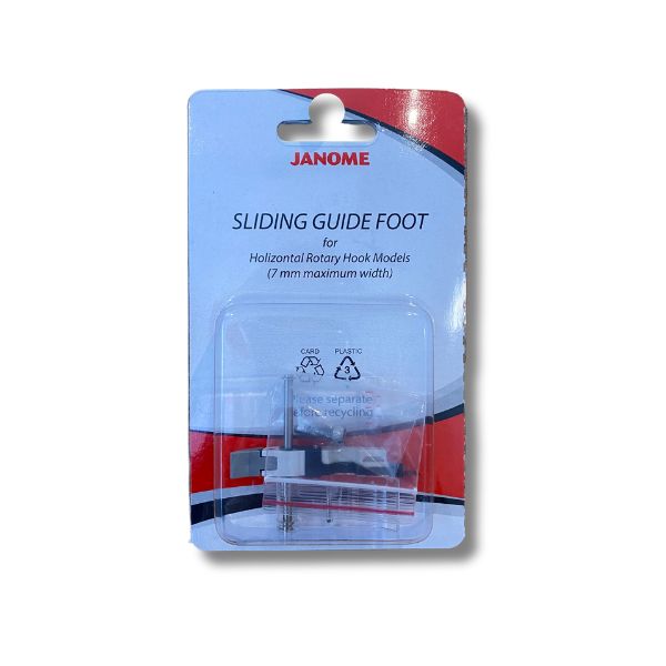 Janome Sliding Guide Foot 202218005. The Sliding Guide foot has many attributes that make edge stitching a breeze. Because the guide can be moved freely, various edge-stitching widths can be sewn. The foot has a scale with markings in inches and millimetres to match your sewing needs. It is useful for tasks which require very accurate seaming such as 5/8″ and 1/2″ seams.