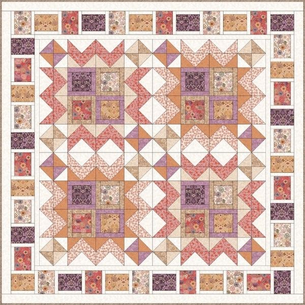 This striking quilt showcases the Jardin d’Automne fabric collection in all its seasonal beauty. Featuring a rich palette of warm golds, soft terracottas, dusky mauves, and natural tones, the design highlights the delicate florals, butterflies, and seed motifs that define the collection.