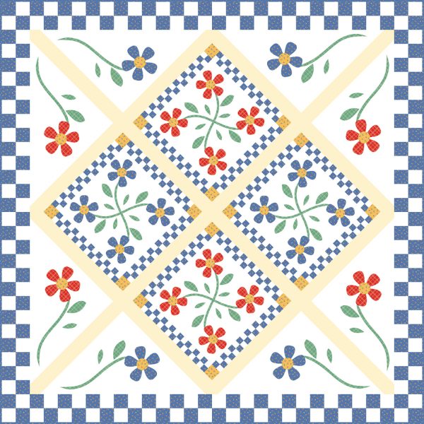 Clean Crisp appliqué flowers as tiles with blue check on point with a larger border for that kitchen fresh zest.