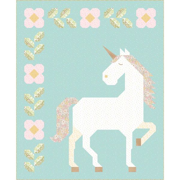 KT-18320 Unicorn Garden Quilt Kit with Collector’s Box by Apples and Beavers, Riley Blake includes all the fabrics for the quilt top, binding, and the pattern.  The quilt kit features a gorgeous white floral unicorn with smaller pink flowers and green leaves on a bright teal background, showcasing fabrics form the Little Posies collection. Measuring approximately 59″ x 72″, this whimsical quilt kit is the perfect addition to any child’s room.