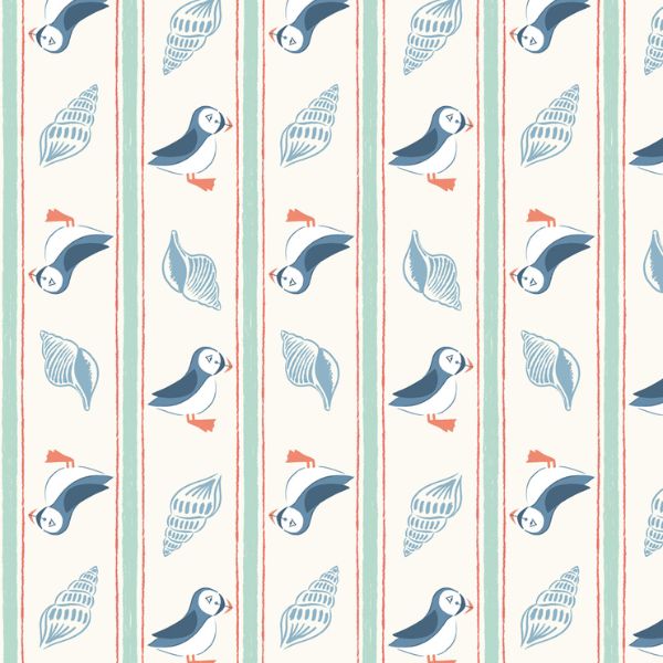L1.A Puffin Stripe, Seas the Day by Lewis & Irene is featuring playful puffins and seashells. Alternating rows of puffins and shells framed by hand drawn stripes create a whimsical yet structured look. With a breezy palette of sea foam, coral, and soft cream, this design is perfect for summer quilts, nautical décor, and coastal inspired handmade makes. Both eye catching on its own and versatile as a blender, Puffin Stripe adds a fresh splash of seaside style to any project.