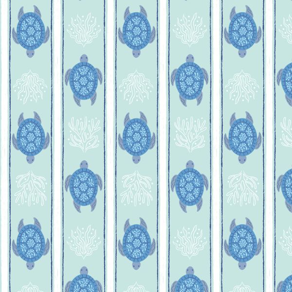 L1.C Turtle Stripe, Seas the Day by Lewis & Irene is featuring gentle sea turtles gliding between delicate coral motifs. The vertical stripe layout, in soothing shades of aqua, navy, and white, creates a fresh coastal look that’s both serene and playful. Perfect for nautical quilts, beach-themed décor, and ocean-loving sewing projects, this design captures the peaceful beauty of life beneath the waves.